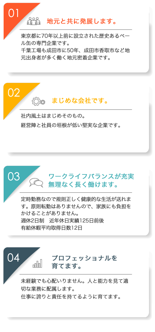 | 業務内容 | ・ペール缶製造機械のオペレーター ・製造ラインの製品検査 ・パッキン他のペール缶関連部品製造 ・その他ペール缶製造に関わる業務 |
